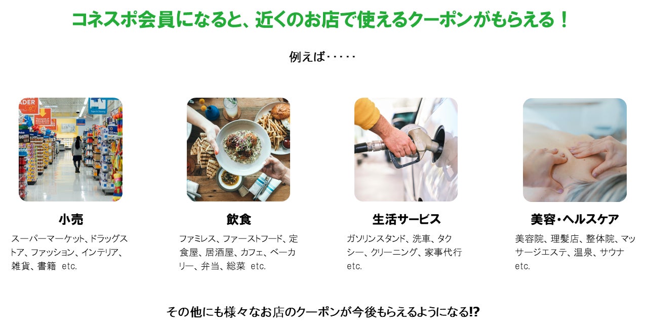 この度、コネスポ合同会社(本社:千葉県柏市、以下当社)は、スポーツをしている会員に対して、クーポンを提供できるオンラインサービスを12月1日より開始いたしますので、お知らせいたします。当社は、昨年8月よりスポーツをしている方々の生活を少しだけ豊かにすることを目標に、事業を展開しております。スポーツをしているから、クーポンがもらえるという新しい付加価値を社会に提供することで、将来的にスポーツがしやすい環境を創出いたします。