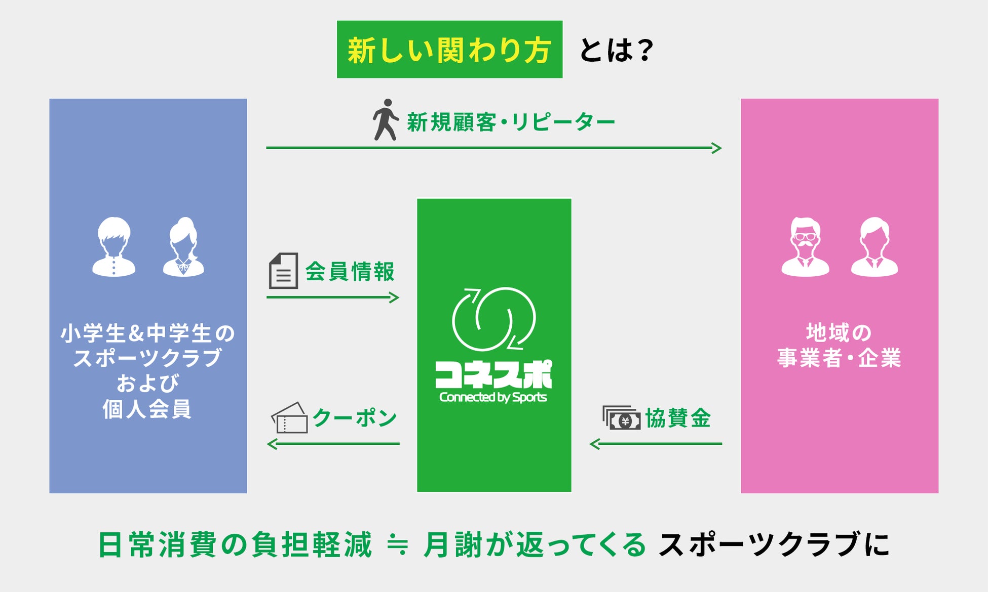 地域の企業や事業者には、特定のスポーツクラブや個人ではなく、その地域でスポーツをしている会員に対して、クーポンという形での支援を行ってもらいます。クーポンによって、会員の日常消費の負担を軽減すると共に、企業や事業者の新規顧客獲得や売上に貢献します。